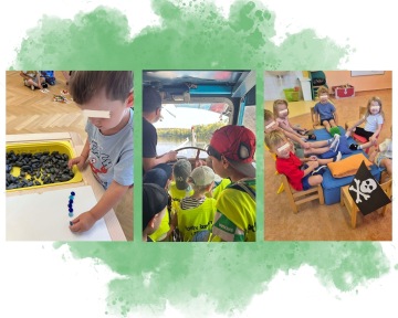 Protože podmořský svět ukrývá spoustu zajímavostí a témat, věnovali jsme se mu i v srpnu. Menší děti na Břevnově si povídaly o potápěčích, vyzkoušely si šnorchl i ploutve 🤿 a dozvěděly se spoustu nových informací. Větší děti se zase pustily do poznávání medúz. Stavěly je z kostek, malovaly temperami i vybarvovaly v pracovních listech. Nejmladší dětičky z Budyšínské si hrály na záchranu zvířátek v moři. 🐢 Vyzkoušely si, jaké to je být hrdinou a zachránit třeba mořskou želvu. Děti ze Žižkova si v ranní pohybové chvilce vyzkoušely překážkovou dráhu s názvem Pozor, žralok! 🦈 a v centrech aktivit si užívaly mořský senzorický box. Hned první srpnový týden vyrazily děti ze Žižkova na výlet do Mořského světa, 🐠 kde mohly na vlastní oči vidět spoustu mořských živočichů. Po návratu se pustily do vyrábění korálových útesů, které si tak mohly lépe představit. V Krči si děti nejvíce užívaly „sensory play“ jako je lovení rybiček z vody, hledání živočichů 🐟 a spoustu dalších oblíbených aktivit. A samozřejmě nechyběl pobyt na čerstvém vzduchu. 🌳 Děti vyrážely na forest day do přírody nebo si hrály na školkových zahrádkách, kde si užívaly sluníčka ☀️ i méně příznivého počasí.