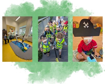 Další týden přinesl nové téma: piráty 🏴☠️, kteří k mořskému světu neodmyslitelně patří. Větší děti z Břevnova odstartovaly pirátský týden pohybovou chvilkou na pravou pirátskou hudbu. 🎶 V ranním kroužku si povídaly o tom, jak pirát vypadá, jaké má vlastnosti, a v centru aktivit si vyrobily pirátské čepice. Menší děti ze Žižkova se rovnou vydaly na pirátskou cestu. Popadly kormidlo, vzaly dalekohledy 🔭 a vyrazily za dobrodružstvím. V sensory koutku na ně čekalo hledání pokladu 💎 a v ateliéru společná výtvarná práce. Větší děti ze Žižkova se vydaly na Ostrov pokladů. Vyrobily si čepice, zkoumaly mapy 🗺️ a řešily pirátské úkoly. Počasí přálo, a tak se hodně času trávilo venku. 🌞 Děti z Břevnova si užívaly pobyt na Ladronce nebo v parcích s vodními prvky. 💦 Děti z Budyšínské si hrály na naší školkové zahrádce, děti ze Žižkova vyrazily na výlet autobusem. jejich cíl výletu bylo Dvořákovo nábřeží, kde pozorovaly lodě a dokonce si pak samy jednu loďku složily. 🚢 Čimické děti přesunuly ranní kroužek ven na školkovou zahradu, kde tvořily a učily se pod širým nebem. V tomto týdnu si děti užily také cvičení s Matějem, 🤸 které probíhalo v parcích poblíž našich školek.